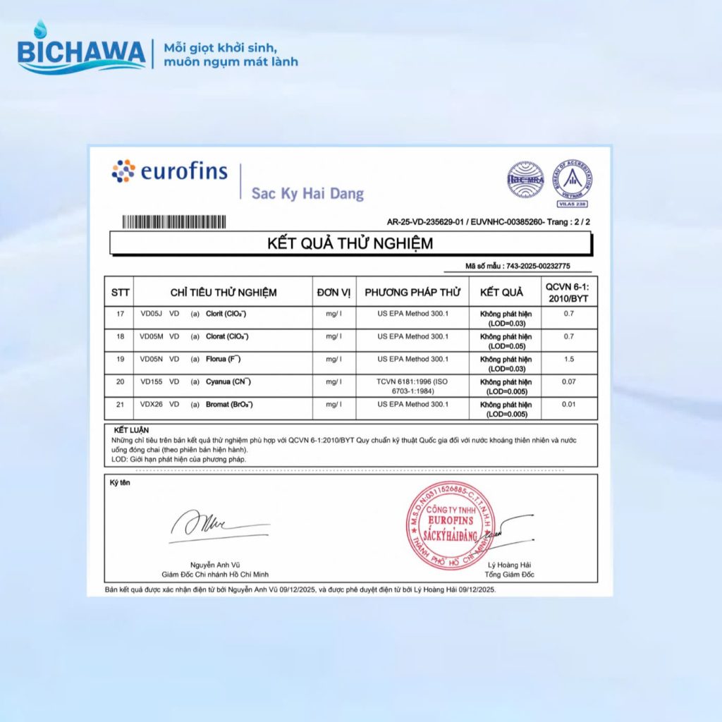 Nước sạch không phải là cảm giác, mà là con số biết nói. Aqua Bình Châu đã được đơn vị kiểm nghiệm độc lập Eurofins phân tích và chứng nhận chất lượng theo QCVN 6-1:2010/BYT.